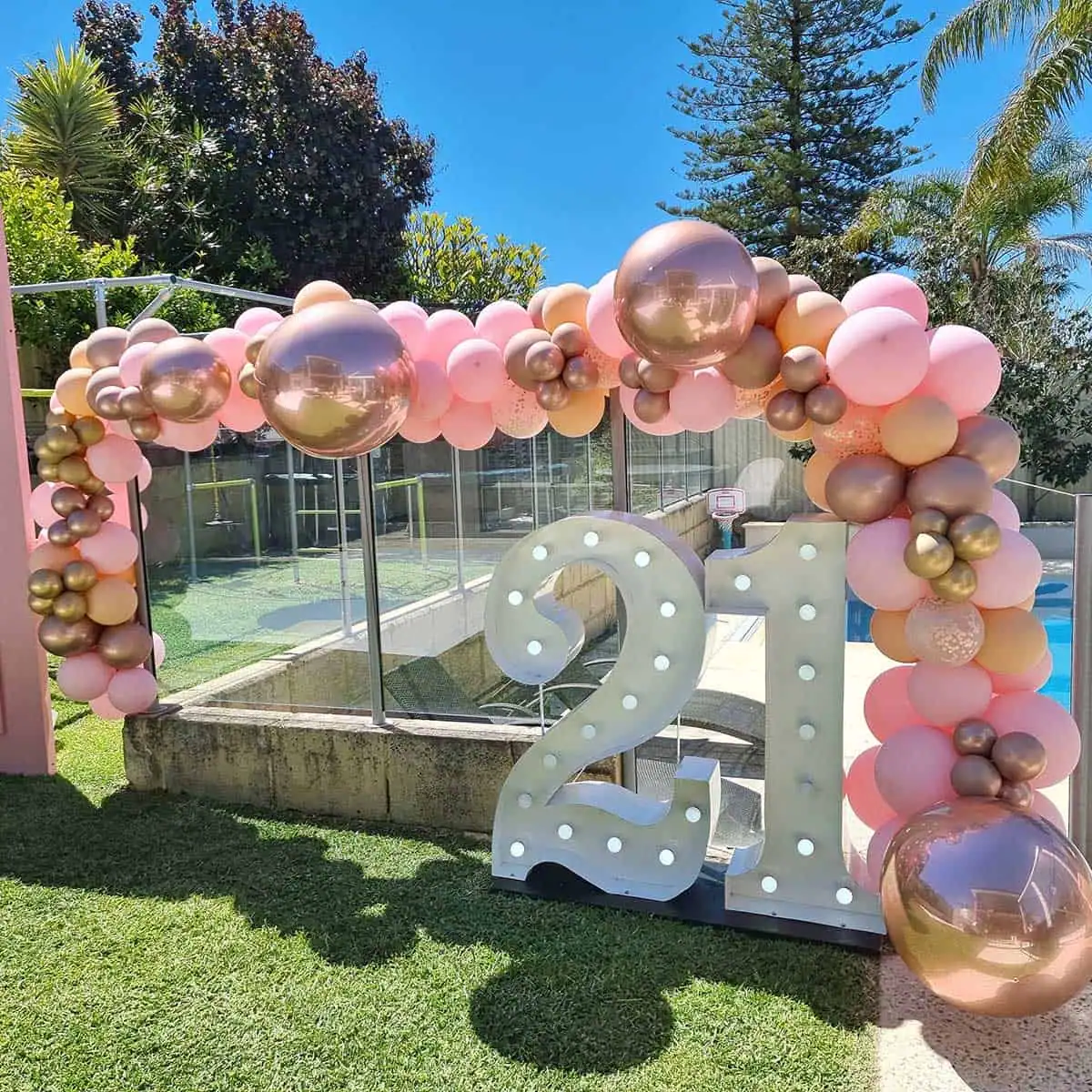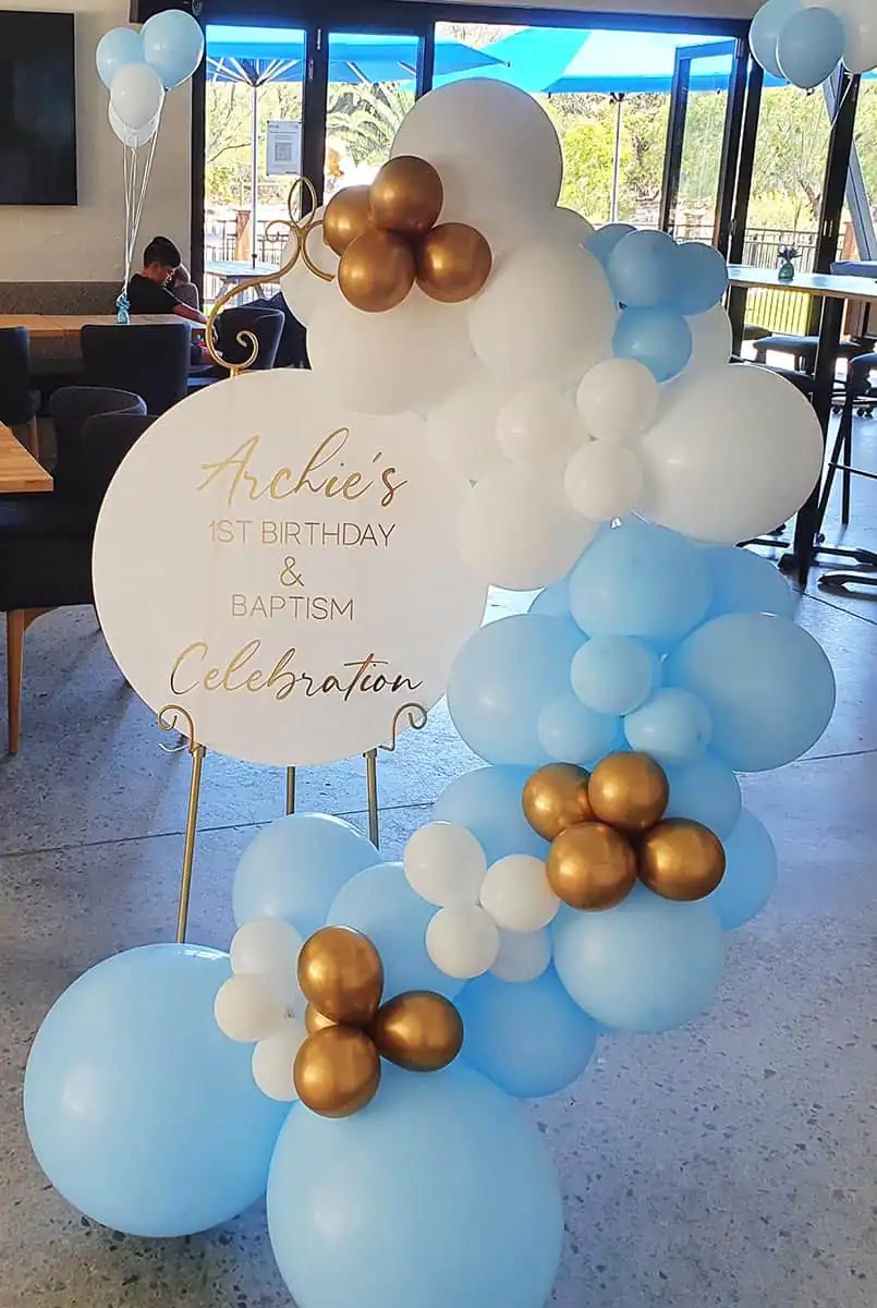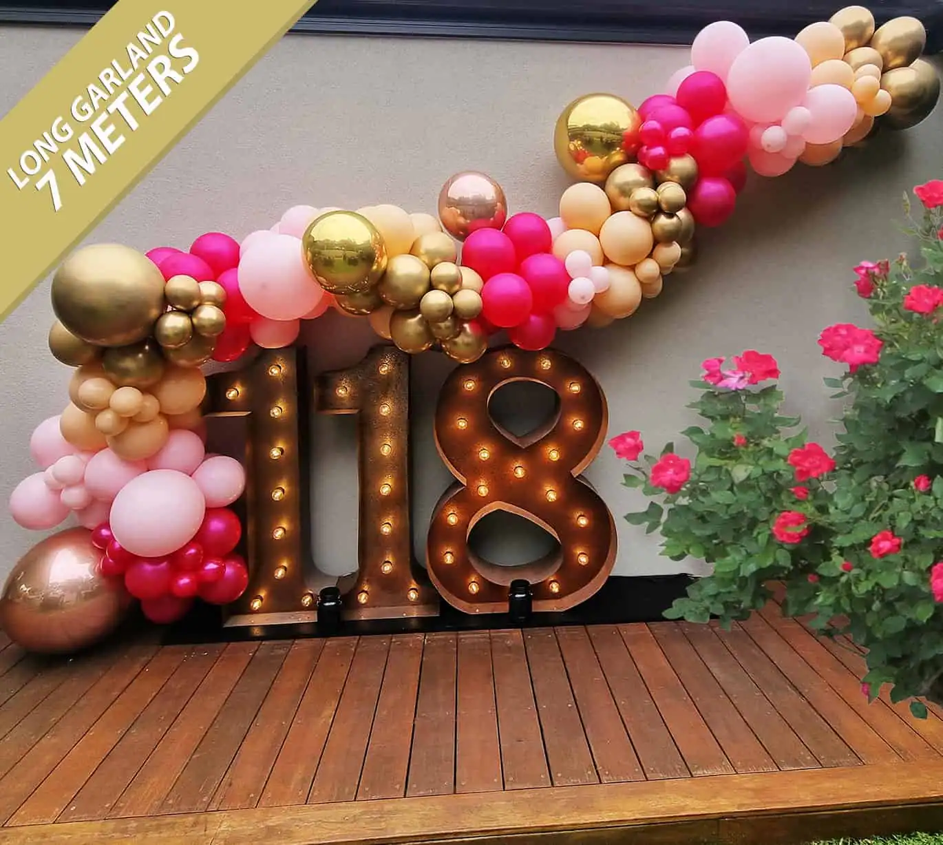 A beautifully tailored balloon garland to make your event space pop! Perfect for birthdays, corporate events, Christmas parties and other special occasions. Our balloon garlands are crafted from an unlimited range of colours – whatever your theme, we can make something to match. Pair these with our light up numbers for a gorgeous birthday party photo backdrop. Available in three standard sizes: Short – 3m; Medium – 5m; Long – 7m. For a garland longer than 7m, please contact us for a quote. Additional installation fees may apply depending on location. Check out more photos of this product on our Facebook and Instagram pages.