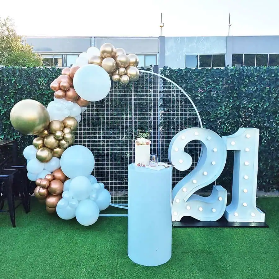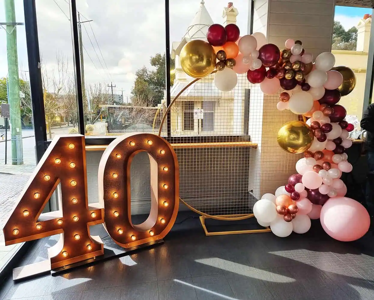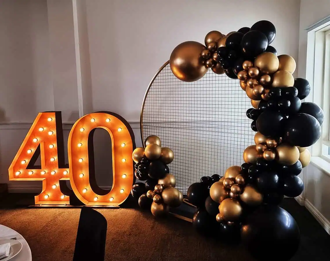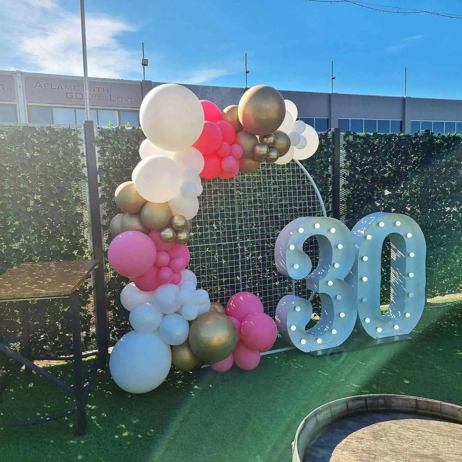 Transform your event into into something truly magical with the Plus Package. This package includes a 2m mesh frame in your choice of white, black or gold with 3m balloon garland and two light up numbers or letters.