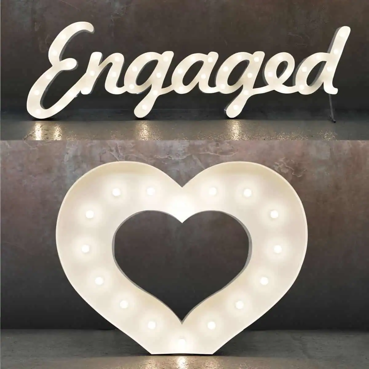 A match made in heaven! Save on your hire when you book these two together – an enchanting romantic statement perfect for your engagement party or photoshoot. The light up Engaged + Heart combo is available in dreamy white, rustic gold, or groovy RGB!