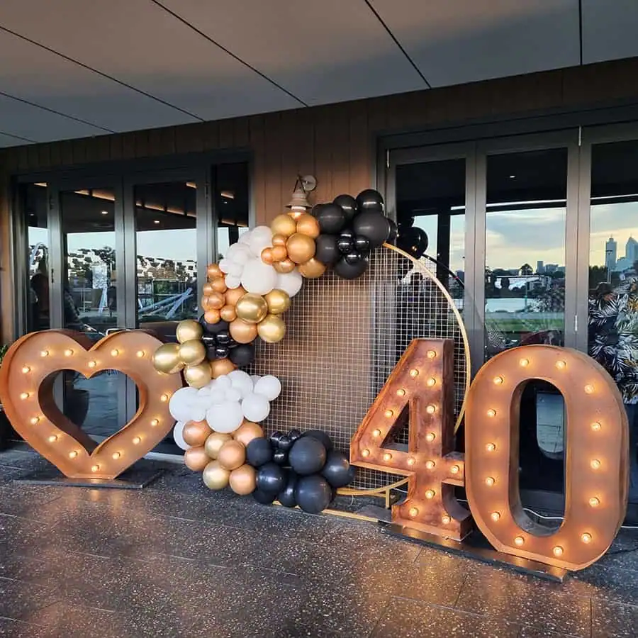 Everything you need to transform your event into into something truly magical! The Works package includes a Shimmer Wall (gold, silver or rose gold), a mesh frame in your choice of black, white or gold, a 3m balloon garland and your choice of five Classic White or Rustic Gold light up letters PLUS a giant light up heart!